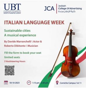 La XXIII Settimana della Lingua italiana e’ stata inaugurata a Gedda presso la prestigiosa Università for Business and Technology, con una lezione spettacolo del Duo italiano Mumble Teatro (Davide Marranchelli- Roberto Dibitonto) intitolato “le Città invisibili”. La lezione, che è stata seguita dalla Dirigenza dell’Università e da circa un centinaio di appassionati di italiano ha coinvolto il pubblico in un viaggio nell’universo immaginario di Calvino in connessione con il tema della sostenibilità ambientale. Particolarmente apprezzato e molto godibile l’interattività con il pubblico, che grazie ad una narrazione vivace e all’accompagnamento musicale dal vivo (brani d’opera italiana) ha potuto accostarsi in maniera spontanea e curiosa al nostro autore e alla nostra lingua. Rilevanti anche le connessioni e il parallelismo tra i cambiamenti della società italiana del dopoguerra e la grande modernizzazione e radicale trasformazione della società saudita nel quadro della “Vision 2030”.